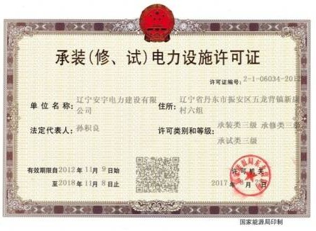 安宇電建獲得地基基礎工程叁級資質,建筑機電安裝工程承包叁級資質,輸變電工程承包叁級資質及東北能源局叁級承裝,叁級承修,叁級承試資質